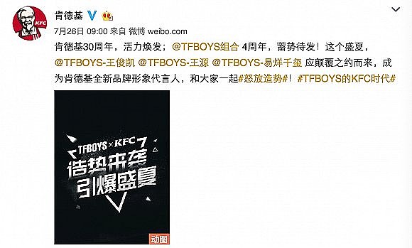似乎没有什么中国品牌像肯德基那样拥有如此阵容强大的代言人。2016年肯德基签下鹿晗与李宇春,而7月26日它又在自己的官方微博上宣布TFBOYS成为自己的最新代言人。5个月前,肯德基还签下了薛之谦。