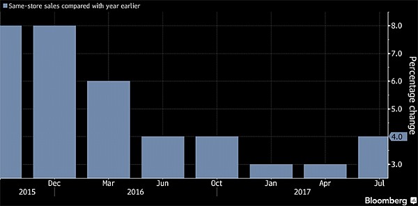 (星巴克全球同店增长趋势,图片来自:Bloomberg)