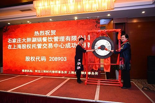 2016年3月25日,石家庄大胖涮锅餐饮有限公司在上海股权托管交易中心正式挂牌上市,股权代码“208903”,成为中国首家骨汤火锅挂牌上市的餐饮连锁企业。上海股权交易中心领导为大胖涮锅餐饮有限公司颁发了纪念牌,12点58分,在众人的期待下,董事长成荣芹女士敲响了挂牌上市的锣声,这标志着大胖涮锅成功对接资本市场,成为一家公众型企业,是其进入了一个全新发展阶段的里程碑。