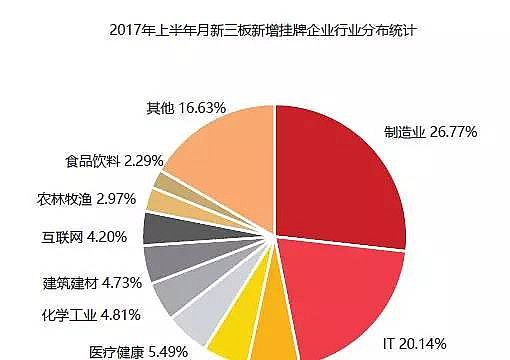 《新三板上半年数据报告》显示,上半年新增挂牌企业行业共计23类CV一级行业,目前新三板挂牌企业地域分布、行业分布趋于多样化。新三板新增挂牌企业从CV行业分布来看,制造业、IT依旧排名前两位,共计351家和264家,分别占比26.77%、20.14%。制造业26.77%,IT、制造业占据挂牌主流。
