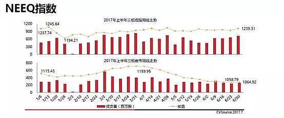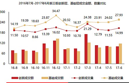 本年创新层累计成交金额653.36亿元,基础层累计成交金额592.16亿元。本年创新层累计成交数量82.25亿股,基础层累计成交数量136.94亿股。6月创新层成交金额100.79亿元,环比下降1.96%,成交数量14.99亿股,环比增长29.82%;基础层成交金额116.52亿元,环比上涨18.49%,成交数量27.93亿股,环比增长16.30%