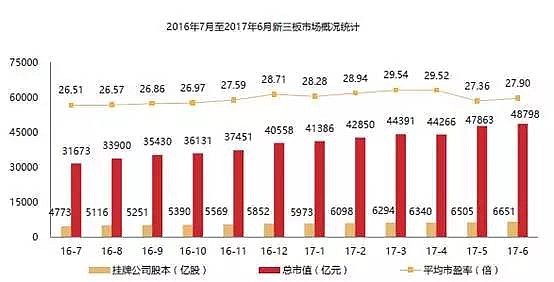 根据投中研究院《新三板上半年数据报告》,截止至2017年6月30日,新三板总挂牌企业家数已达到11314家,创新层企业1392家、基础层企业9922家。总股本6651.01亿股,环比上涨2.24%,总市值48798.4亿元,环比上涨1.95%,整体市场平均市盈率达到27.9,环比上涨1.97%。