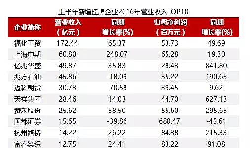福化工贸以172.44亿元的营业收入排在上半年新增挂牌企业首位,营业收入同期增长率65.37%,其归母净利润0.54亿元,同期增长49.69%。净利方面,国都证券以6.80亿元的归母净利润排在上半年新增挂牌企业首位,归母净利润同期下降45.61%,其营业收入15.65亿元,同期下降39.86%。