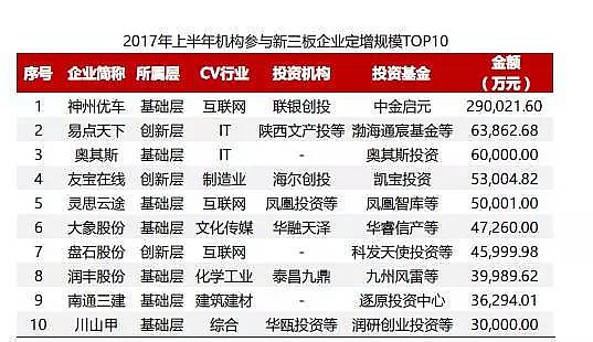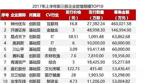 4月28日,神州优车发布公告,中金公司作为主承销商,成功募集资金人民币46亿元。神州优车成为上半年定增王。排在第二位的开源证券募资总额14.7亿元,以支持其扩大业务,加快发展。易点天下在挂牌后共计增发4次,3月拟借壳吉宏股份,最后终止,今年5月成功募集6.38亿元。