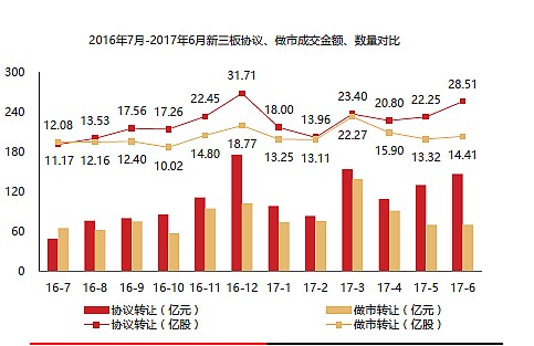 6月成交金额217.31亿元,其中做市成交70.33亿元,环比下降0.28,协议转让146.98亿元,环比增长12.54%;成交数量42.92亿股,其中做市转让14.41亿股,环比增长8.22%,协议转让28.51亿股环比增长28.16%。