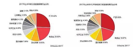 上半年新三板企业行业定增规模中IT行业占比最大,达25.42%,其次是制造业,占比20.93%,文化传媒排在第三位。上半年新三板IT行业获得VC/PE投资规模占比最大,达29.66%,其次是制造业,占比18.07%,在VC/PE投资规模中,医疗健康超过文化传媒行业排在第三位。