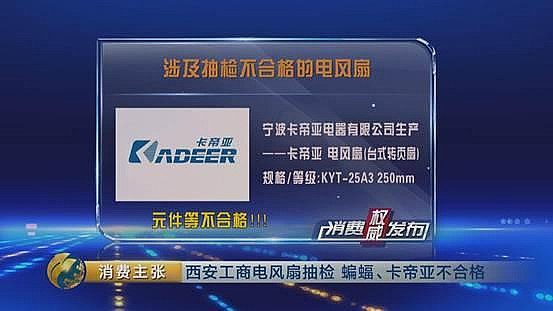 宁波卡帝亚电器有限公司生产的卡帝亚电风扇,元件等不合格。