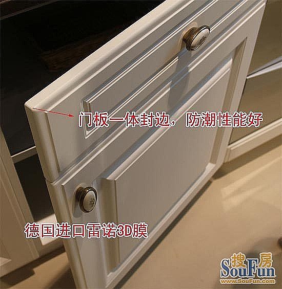 此款橱柜是进口模压门板,18mm奥地利进口E1级环保板材,表面采用德国进口雷诺的3D膜,厚度是国产膜的40倍,色泽光亮,光感非常柔和细腻,表面舒适感强。门板一体封边,整体效果美观、高档,防潮性能比较好。
