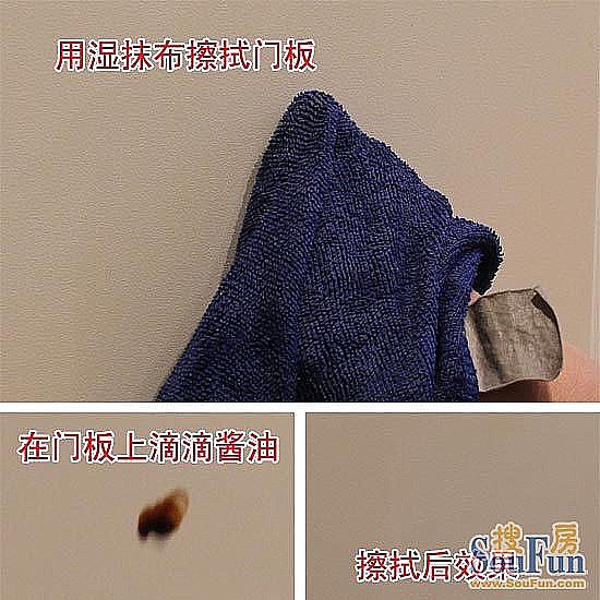 现场导购员在门板表面滴上酱油,稍等片刻用湿抹布擦拭,擦拭后表面看不出任何污渍。可见,门板防污性比较好,易于日常打理。