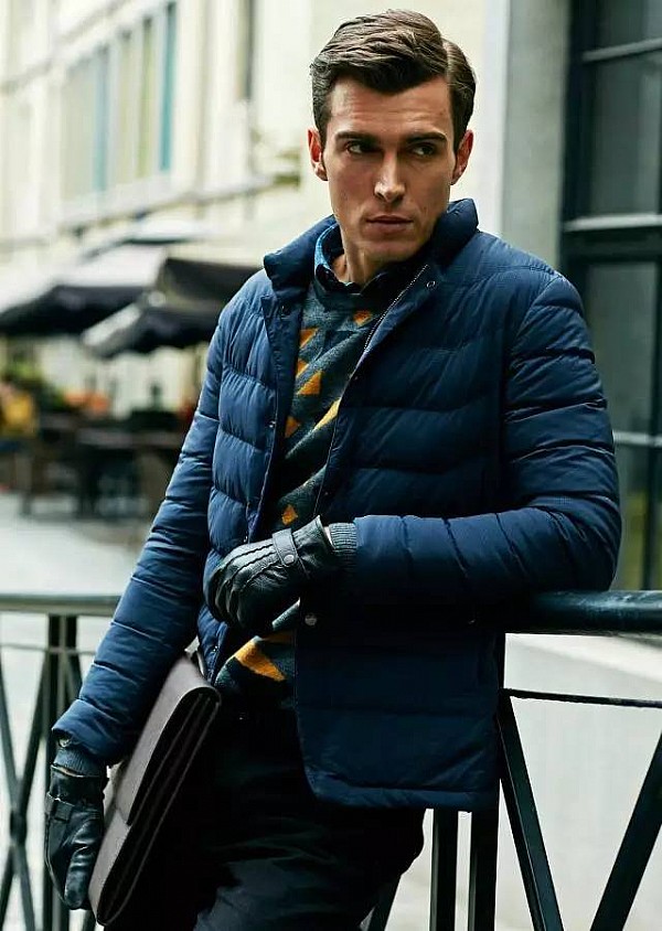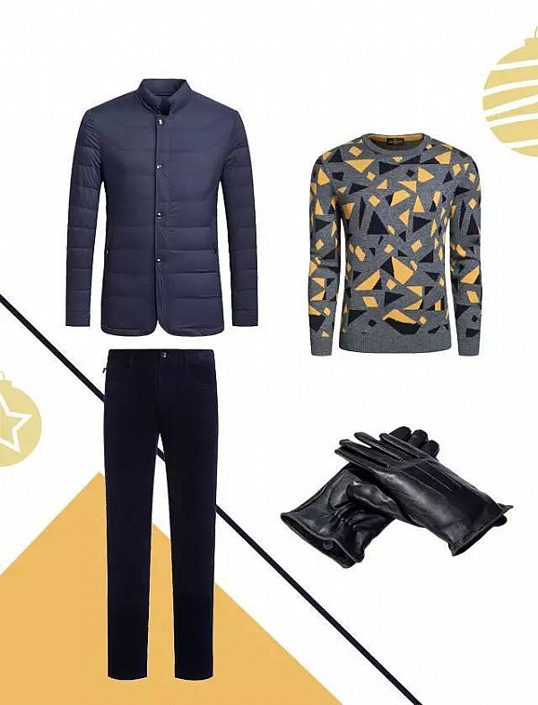 圣诞肯定要亮眼一点,毕竟在圣诞节有些灯光会比你穿的还要亮眼一些。那么,可以使用一些在瞬间就能吸引人眼球的艳丽色彩来为整体造型加分,好比说穿透力十足的姜黄色。姜黄色填充几何元素,让以灰色打底的毛衫充满雅痞范。再来件与姜黄极搭的军蓝色羽绒服,带上皮手套,让你成功吸睛的同时也会被大赞好品味。