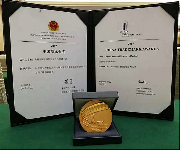 日前,由国家工商总局、世界知识产权组织联合举办的中国商标金奖颁奖大会在江苏省扬州市召开,内蒙古鄂尔多斯资源股份有限公司荣获商标运用奖。