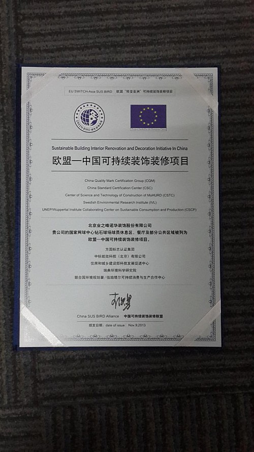 2013年,业之峰还获得了“欧盟-中国可持续装饰装修项目”认证,这体现了业之峰环保装修的水准,已得到国际先进水平的认可。
