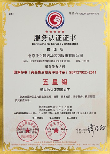 在很多消费者看来,装修是一个低端行业,服务问题一大堆,让人闹心。针对这些痛点,业之峰着力打造高品质、全方位的服务体系,帮助消费者解决装修困扰。2012年9月26日,经过第三方严格评审,业之峰以其卓越的服务体系,荣获最高等级标准——五星级服务认证,从而成为家居行业第一家、也是唯一一家通过五星级服务认证的企业。