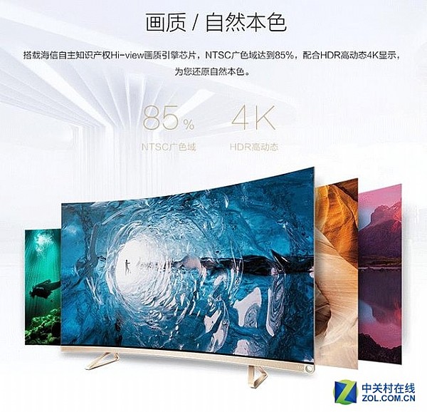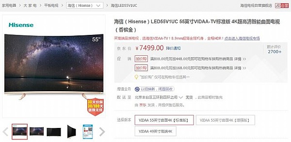 首先笔者为大家带来的是这款海信55英寸曲面液晶电视,该机搭载海信自主知识产权Hi-view画质引擎芯片,NTSC广色域高达85%,配合HDR高动态4K显示,还原自然本色。目前这款海信LED55V1UC曲面电视在京东商城促销7499元,感兴趣的朋友不妨关注一下。