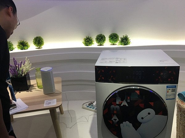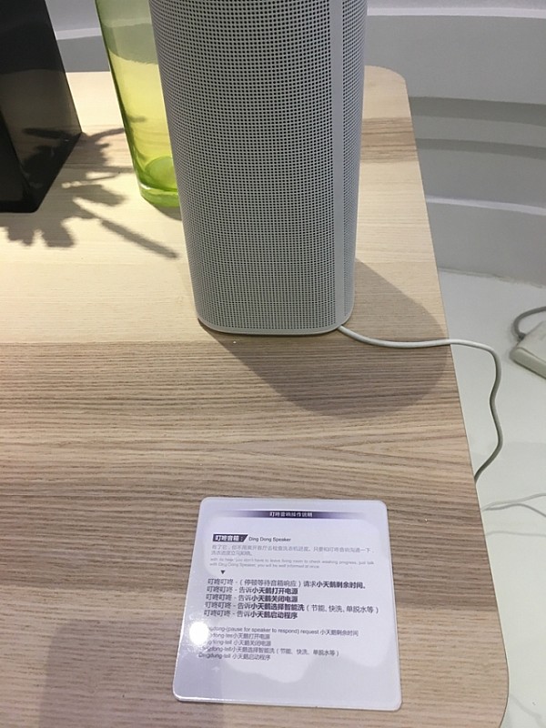 ↑就按照这样的方式对着音响说话,客厅里音响就能操控阳台上的洗衣机。小编在现场亲测,反应灵敏,好用~