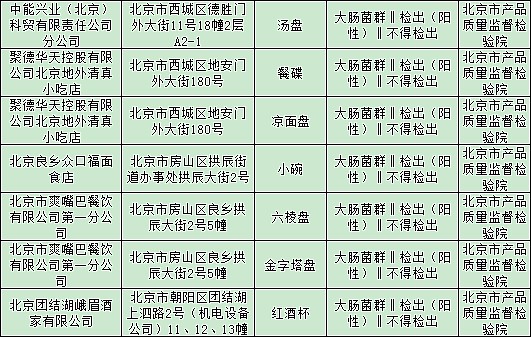 根据抽检公告,北京食药监局在北京绿茵阁餐厅抽检的汤碗、粥碗、肉饼盘,不合格项目为大肠菌群,经检测实测值为阳性,标准值规定为不得检出。同样,在在北京公益桥庆丰包子铺抽检的油条盘、饺子盘、小料碟、凉菜碟、粥碗;在中能兴业(北京)科贸有限责任公司分公司抽检的花边方盘、汤盘;在聚德华天控股有限公司北京地外清真小吃店抽检的餐碟、凉面盘;在北京市爽嘴巴餐饮有限公司第一分公司抽检的六棱盘、金字塔盘;在北京团结湖峨眉酒家有限公司抽检的红酒杯;上述不合格项目均为大肠菌群,经检测实测值为阳性,标准值规定为不得检出。