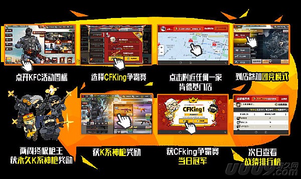 预约成功的玩家在活动时间内,打开游戏界面,点击参赛,可根据LBS引导至最近的KFC门店,参加当日该门店的CFKING争霸赛,参与即得K上校角色。玩家在CF团竞模式中,击杀人数最多者成为该店NO.1CFKing,获得新鲜出炉的K系神枪使用权。每天全国5000家门店,5000场CFKING争霸赛同时开战,其中必有属于你的K系神枪哦。