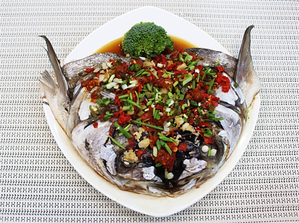 \u00A0 \u00A0 \u00A0\u00A0\u00A03、放上鱼头,摆好造型。撒上切好的青红辣椒、葱丝、蒜,再放入适量的蒜蓉鲜辣酱、蒸鱼豉油。\u00A0