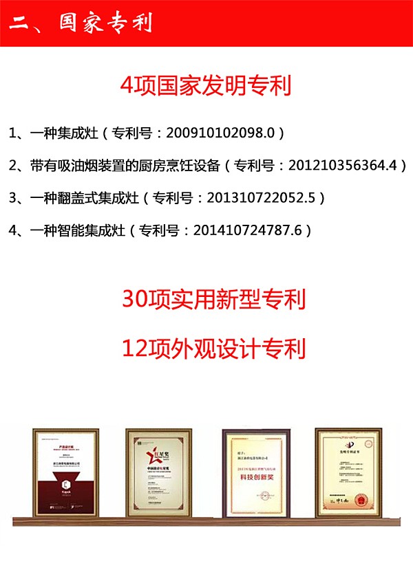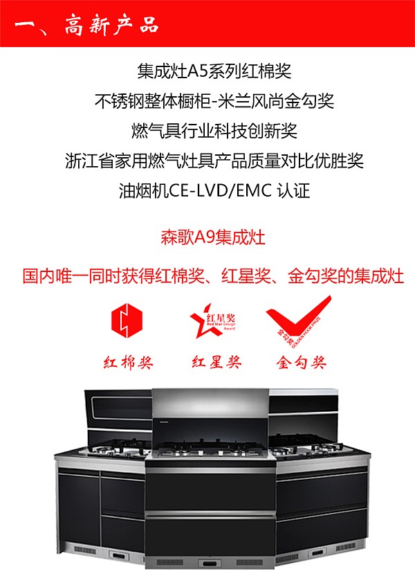 \u00A0 \u00A0 \u00A0 \u00A0森歌创始至今,荣获“四项集成灶发明专利”、“高新技术企业”、“浙江名牌产品”、“浙江省知名商号”等荣誉。 是同时获得“红棉奖”、“红星奖”、“金勾奖”三大奖项的唯一一家集成灶企业,众多奖项的获得使森歌成为行业中的翘楚。\u00A0