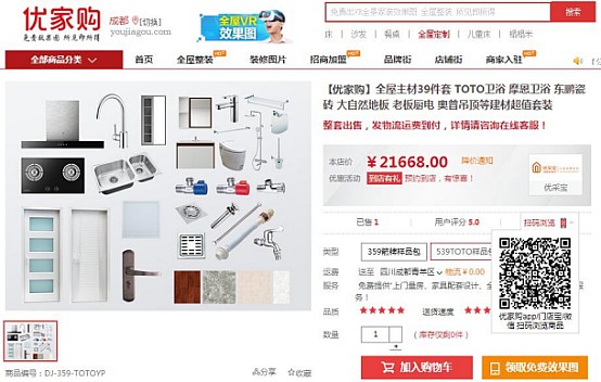 据优家购负责人介绍,优家购已陆续上线TOTO、摩恩、东鹏、汉斯格雅、美标、樱花等35个国际知名建材品牌。同时,将各大建材产品组合成建材超值套装包。消费者可根据自己的个性化需求,直接登陆优家购官网或到优家购全国线下体验馆,选购相应的建材超值套装包,享受全屋家居建材,一站购齐的置家体验。