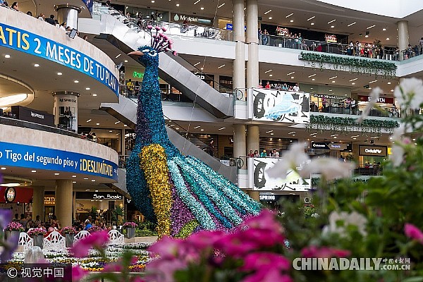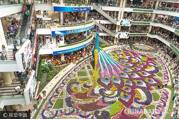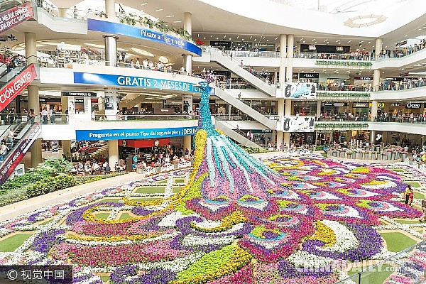 中国日报网8月2日电(黄硕)当地时间2017年8月1日,哥伦比亚麦德林的圣达菲购物中心为迎接“鲜花节”展出一个由182万朵花打造的三维的孔雀,高达12米。