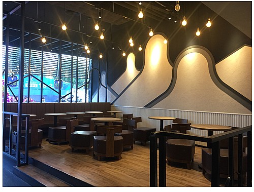 镬耳屋、雨棚、青砖墙、满洲窗这些岭南传统建筑元素与皮质沙发、玻璃金属混搭的灯具、黑色框体线条灯现代建筑元素拼凑在一起,铺设出百花餐厅的时代感。这家20年前开业的餐厅曾是佛山第一家肯德基,如今旧貌换新颜,携着许多佛山青少年的记忆一起,重新绽放在百花广场。