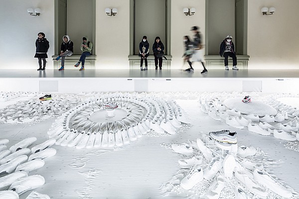wonderwall的设计师片山正通(masamichi katayama)为纪念耐克经典款气垫鞋air max三十周年设计了一个景观花园,在东京的国家博物馆中展出。该设计通过不断重复的圆形图案与这款经典鞋款相结合,最终打造出了一个优雅而井然有序的展览。\u00A0