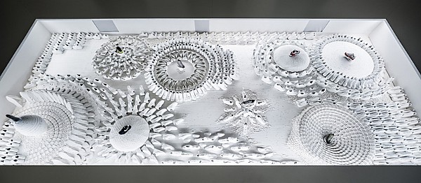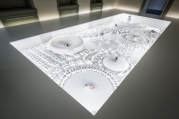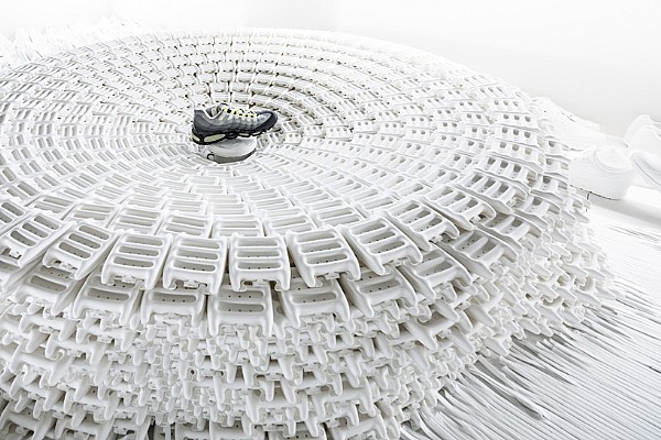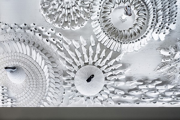 wonderwall与发型化妆师asami nemoto合作,将耐克的一系列白色球鞋以不断重复的形式呈现在花园中,而真正的全色系air max则全部置于花园顶部不断旋转展出,二者之间形成了鲜明的对比。此次展览的目的在于捕捉“气垫鞋家族”这个主题——对该款设计时至今日发展历程的研究。通过将鞋子展示在花园背景之下,表现了该设计的自然属性,从的设计的根源一直到其不断演变的各种形式。