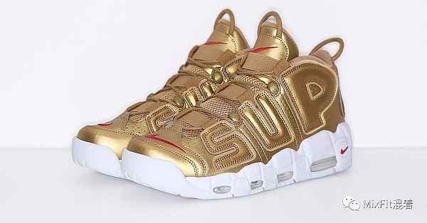 当然不能忘记这两款配色的Supreme x Nike Air More Uptempo了。一双是公演时穿着的金色,一款是拍摄节目宣传照时穿着的红色。