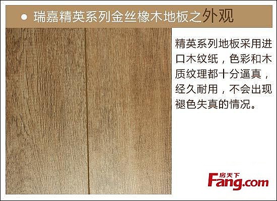 外观是吸引顾客的第一要素,这款地板在外观赏受先就给测评员一种清新自然的感觉,纹理清晰丝毫没有过犹不及的感觉。店员介绍到这是因为精英系列地板采用进口木纹纸,色彩和木质纹理都十分逼真,而且这种木纹纸的质量十分过硬,经久耐用,不会出现褪色失真的情况。