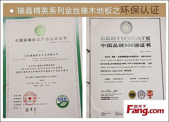 瑞嘉地板的所有产品都通过了十环认证,即地板、地垫、胶水三者加在一起的甲醛含量每升不超过1.5mg,而瑞嘉地板三者加在一起的甲醛含量仅有0.3mg。