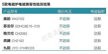 在安全性指标上,第三方权威机构的检测结果显示,5款电磁炉的电磁辐射均符合国家标准限值;但在“骚扰电压”这一项测试中,5款产品则“全军覆没”。