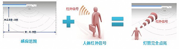 除微波感应控制的方式之外,LED\u00A0T8灯管亮易感应灯还能采用人体红外感应控制的方式。同样的,当有物体进入感应范围并移动时,灯管传感器探测到物体自身产生红外光谱,自动输出高电平频,灯管就会进入全亮模式。