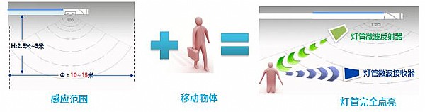 在楼道、车库等地方的感应灯往往反应不够灵敏,给人们造成不便。LED\u00A0T8灯管亮易灯感应采用微波感应控制的方式,感应更灵敏,感应范围更宽广。当有物体进入感应范围并移动时,灯管发射微波信号到物体产生发射,由于“多普勒效应”反射回的微波信号频率发生改变,当灯管微波接收器接收到改变后的微波信号,自动输出高电平频,灯管便进入全亮模式。
