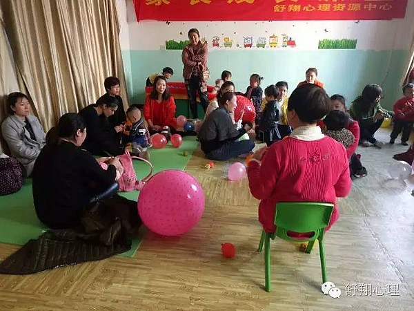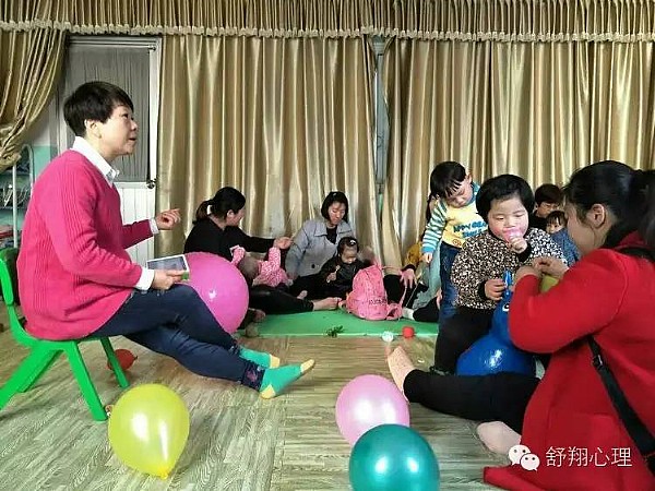 孩子们在布满玩具和气球的场地安全而自由的玩耍和交流,妈妈们也在互动交流。