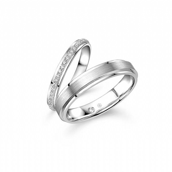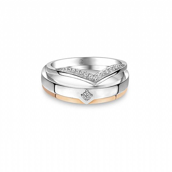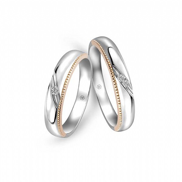 钻石戒指上起伏的线条象征着爱侣间的爱情经历,隐藏在戒圈内壁的钻石恒久璀璨,低调地绽放出羡煞旁人的光芒。红白分明的色调为新人添上几分时尚魅力,钻石在女装戒指的弧线上整齐排列,在18K金相映下更具层次感。