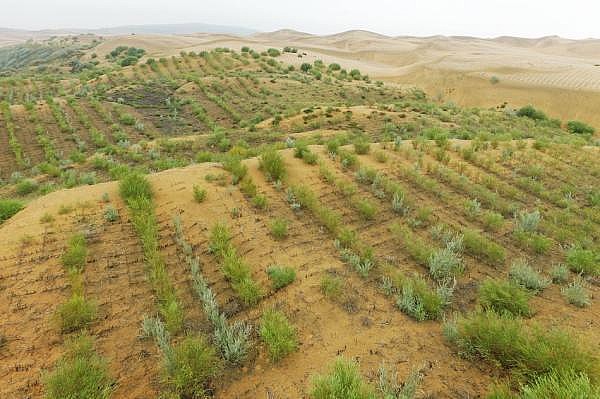 从空中俯视,沙柳枝把沙地分割成一个个约0.5平米“井”字状方格,像一张张大网覆盖于黄沙之上,以达到固沙效果。待雨季到来,再在格子里植树种草,又将有一片片绿洲在沙漠中盘根而起。