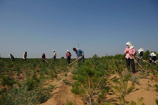 7月19日,工人在库布齐沙漠东部的一处樟子松育苗基地除草。
