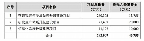 而此次募集的资金主要将用于“营销渠道拓展及品牌升级建设项目”、“研发生产体系升级建设项目”和“信息化系统升级建设项目”。分别占有募集资金1.38亿元、2亿元和1亿元。而对于“营销渠道拓展及品牌升级建设项目”,鄂尔多斯还将自行另外投入24.65亿元,总投资达26.03亿元。
