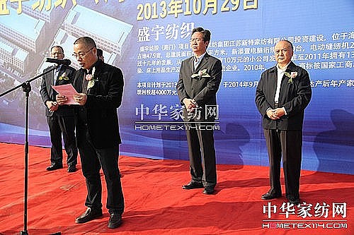 10月29日上午8点58分,盛宇家纺集团江苏新特家纺有限公司工程奠基仪式在江苏海门举行。江苏海门市市长杨曹明,市委副书记、市委常委陆一飞在工程奠基仪式上讲了话。海门市相关部门领导也参加了工程开工奠基仪式。盛宇集团党委书记、副总裁、盛宇家纺集团江苏新特家纺有限公司总经理曾上潮远赴江苏海门,出席了工程开工典礼仪式并讲了话。盛宇家纺集团江苏新特家纺有限公司建设项目,位于江苏省海门市工业园区纺都大道南侧,占地面积47.9亩,总投资2亿元,计划2013年10月开工建设,2014年9月竣工投产,投产后预计年可生产家用纺织品200万套套件,预计年销售收入超5亿元,可实现利税4000万元。