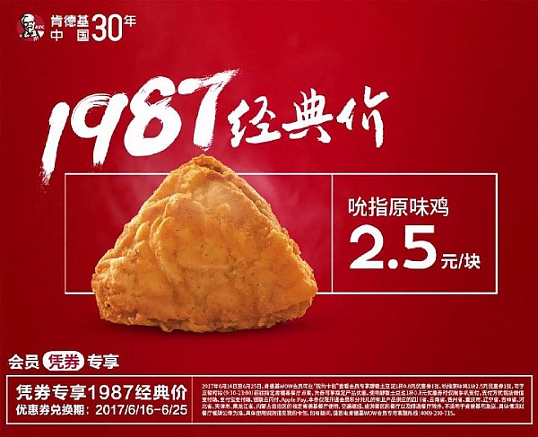 这顿饭让小张吃得很感慨。其实也没什么特别的,自己这岁数本来就不太爱吃这些「垃圾食品」了,只是今天看到原味鸡重回 1987 年价格的广告时,还是略微有点心动。