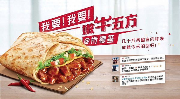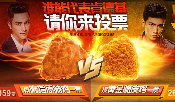 2013 年,肯德基拿出发家产品“吮指原味鸡”和新品“黄金脆皮鸡”制造声势,并邀请陈坤和柯震东为两款产品代言,强行制造了一场“炸鸡大 PK”。