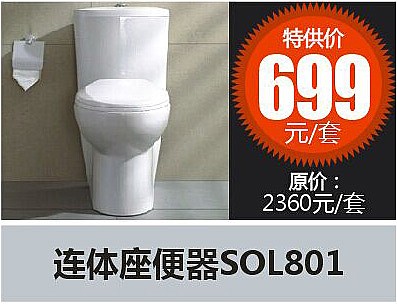 据悉,本次特价款系型号为SOL801的连体坐便器,连体式座便器外部没有连接部分,所以清洁方便安装容易,价格比分体坐便器贵,而本次尚高卫浴打破低价,本款产品将以699的价格回馈给广大业主。