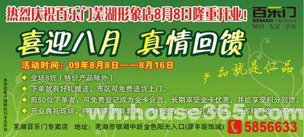 \u00A0\u00A0\u00A0 365地产家居网 芜湖讯\u00A0 2009年8月8日,芜湖百乐门即将隆重开业。百乐门芜湖形象店开业期间,将举行“喜迎八月 真情回馈”活动,活动期间全场产品8折出售(特价产品除外),开业当天前50位下单者,可免费登记成为金卡会员,长期享受金卡优惠。