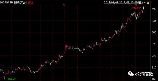 特别是在近次,贵州茅台在2015年8月25日创出160.26元的阶段性低价后,股价开始一路高歌猛进,先后在2015年10月23日再次突破200元、2016年7月6日突破300元、2017年4月19日突破400元,如今离500元大关仅剩临门一脚。