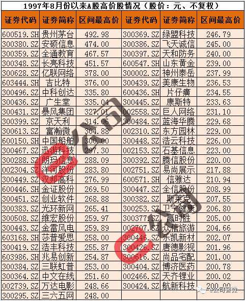 自1997年8月份以来,A股共出现55只股价超过200元以上个股,共有360只个股股价曾破百元。只是城头变幻大王旗,多少股票“眼看它起高楼,又眼看它楼塌了”。