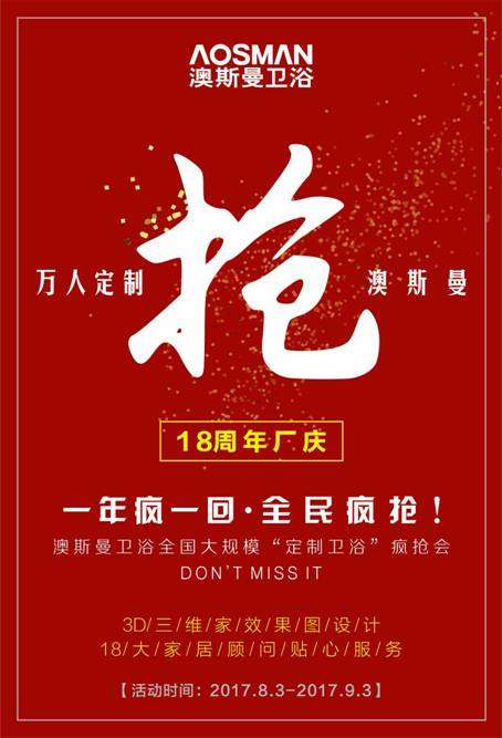 摘要:\u00A0澳斯曼18周年厂庆来袭!\u00A0\u00A0“18年仅疯一回”的澳斯曼卫浴全国大规模“定制卫浴”疯抢会,诚邀您来疯抢!\u00A0\u00A0即日起至2017年9月3日,澳斯曼万人定制精彩“豪礼”送不停!&……