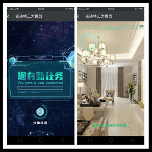 欧神诺陶瓷推出这个名为《瓷砖特工大挑战》的H5游戏,最大亮点就是整个游戏搭载在720°装修效果图上。据悉,欧神诺陶瓷官网欧神诺在线最具欧神诺特色的DIY换砖宝上,已经支持720°DIY换砖,估计,这次H5游戏所运用的就是这个炫酷黑科技技术所衍生的。游戏以寻找线索为主题,找齐所有线索,即能领取福利一份。据内部消息所透露,游戏所能获得的福利包含话费、红包、砖惠券等等总达8888份!