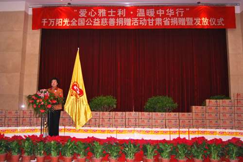 仪式上,原青海省人大副主任、省慈善总会会长杜颖发表重要讲话,她说:“雅士利集团向我省少数民族地区、贫困山区儿童福利院、贫困小学捐赠价值50万元的奶粉。你们的善行义举、真情奉献是对广大儿童的最大关怀,是对慈善事业的大力支持。为了把这批爱心捐赠物资发放好、使用好,不辜负捐赠者的一片爱心,我希望各受援地区的儿童福利院、贫困小学要按照捐赠者和省慈善总会的要求,尽快将捐赠奶粉进行登记造册,发放到位,落实到人。同时,在发放过程中要拍摄、录取相关资料,并通过新闻媒体在社会上大力宣传、报道中华慈善国际互联网救助中心和广东雅士利集团股份有限公司的善行义举、爱心奉献。正是他们扶危济困、回报社会的高尚道德情操,弘扬了中华民族乐善好施的传统美德,倡导了互助友爱、守望相助的道德风尚,也创造了支撑慈善事业发展的良好社会氛围。”她说:“甘肃是一个经济欠发达的内陆省份,同时又是一个自然灾害频发的地区。无论城镇还是农村,贫困人口多,贫困面大,社会救助的任务十分繁重。眼下正值天寒地冻,也正式广大弱势群体最需要得到救助的时候。我们热切期待省内外、海内外富有爱心、善心的企业家和社会各界人士为我省贫困地区奉献爱心、倾注真情,为贫者、弱者建起生活幸福、快乐成长的天堂。”