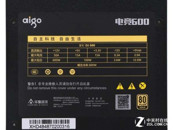 爱国者电竞600的参数铭牌简洁明晰,产品的额定功率为600W,通过了80\u00A0PLUS金牌认证,电源的+12V单路输出就达到了20A即600W,可以为高性能的硬件提供充足的供电。